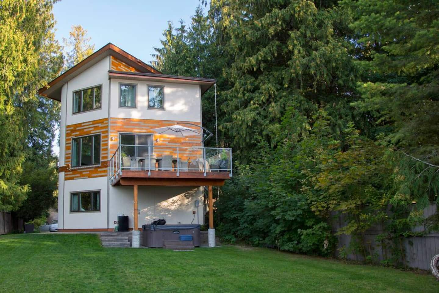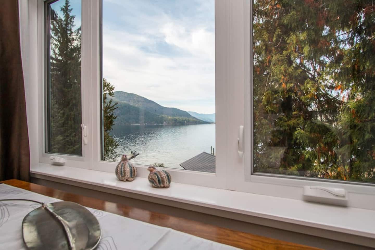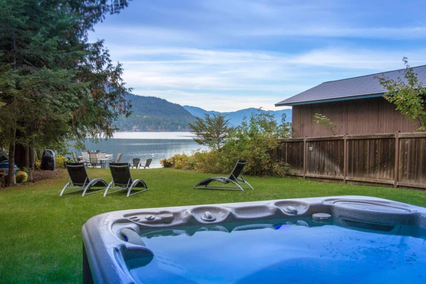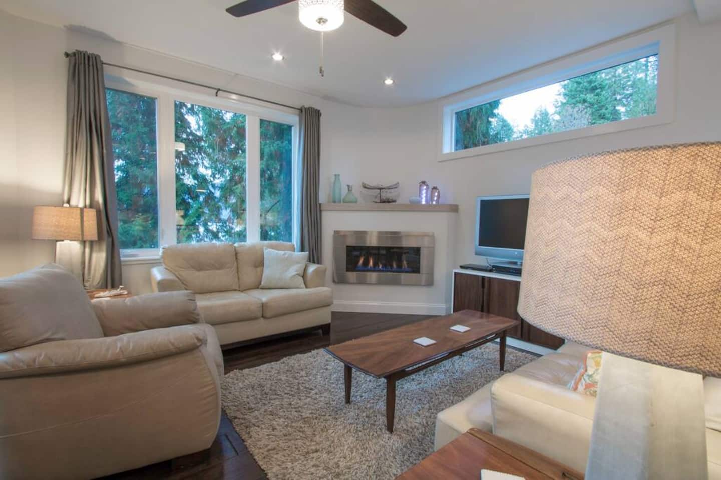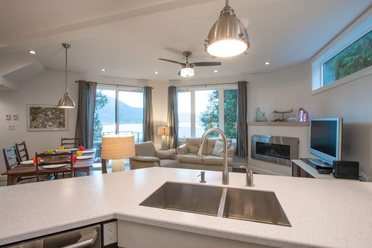 The home is modern and with a beachy feel. There are unique round walls and vaulted ceilings. The lakefront is gorgeous with stunning views up the lake.