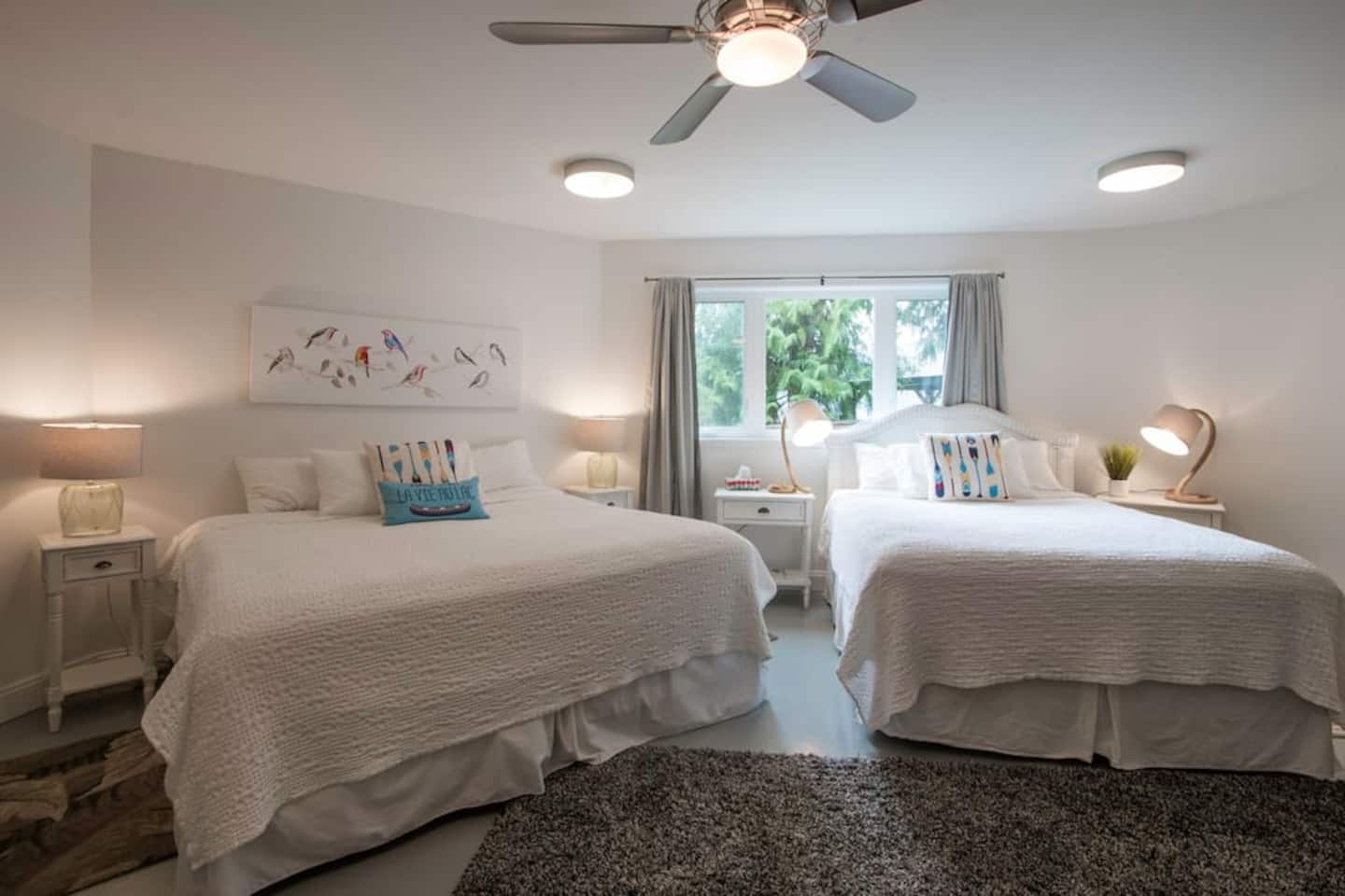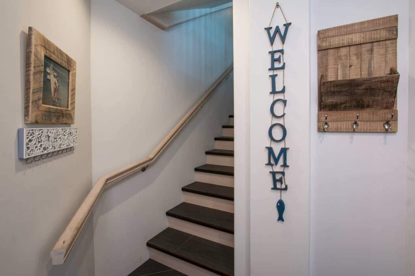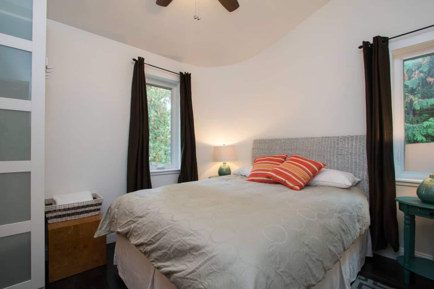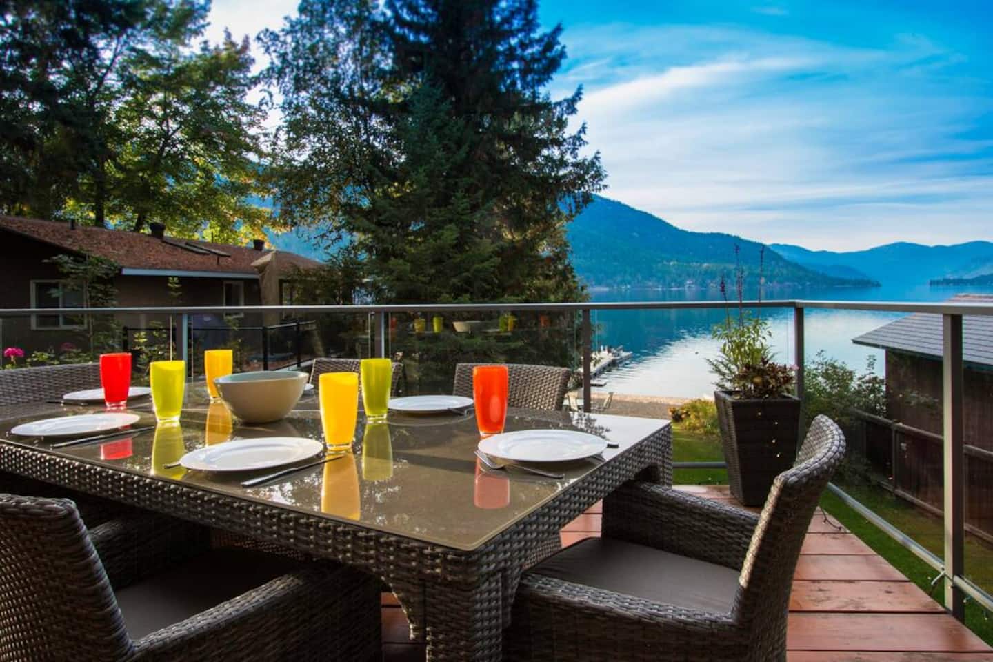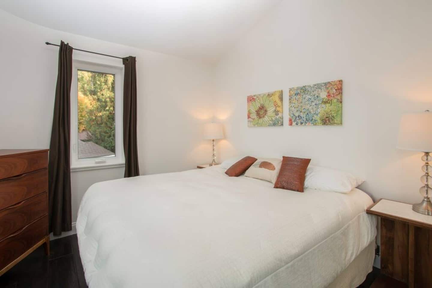 The home is modern and with a beachy feel. There are unique round walls and vaulted ceilings. The lakefront is gorgeous with stunning views up the lake.