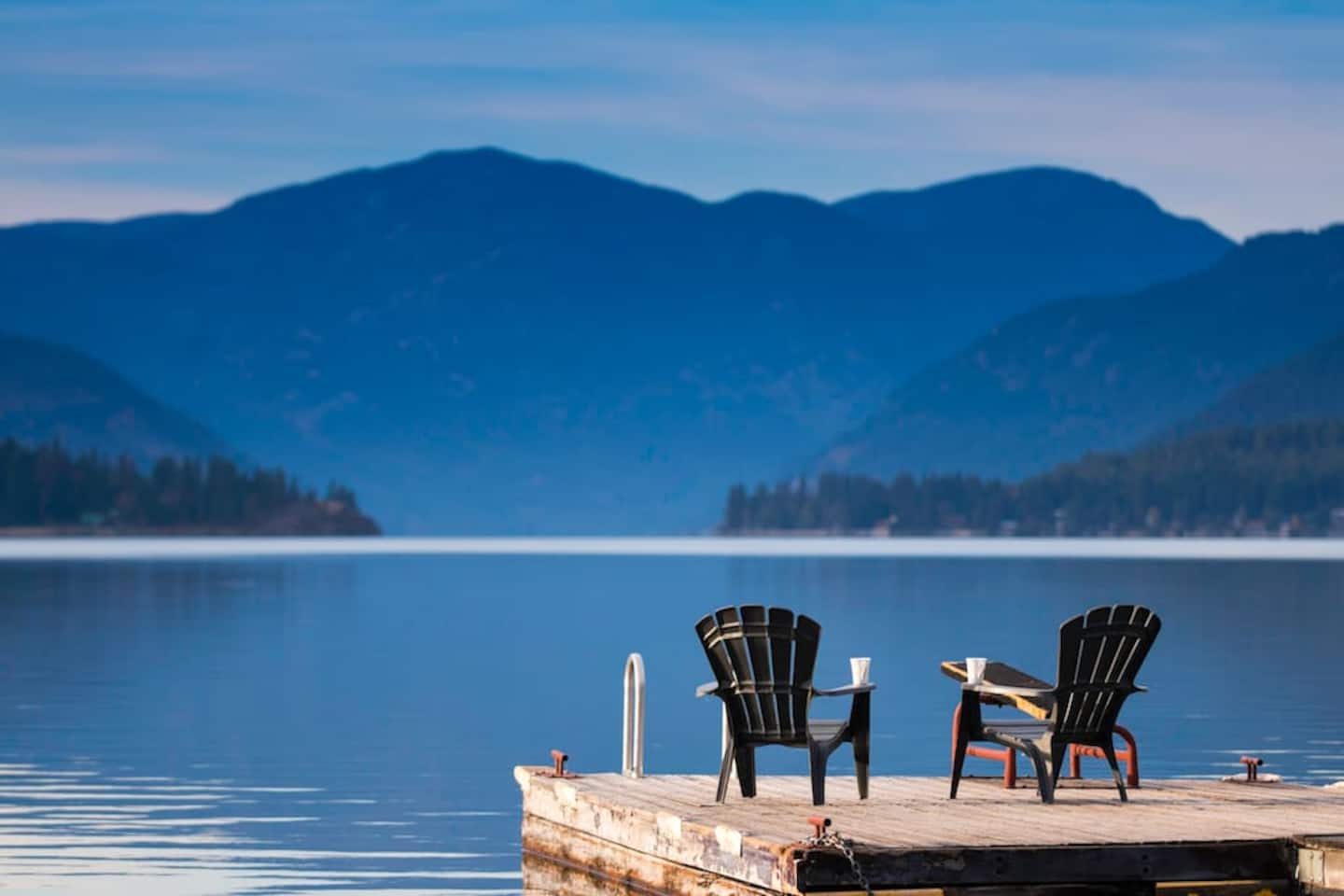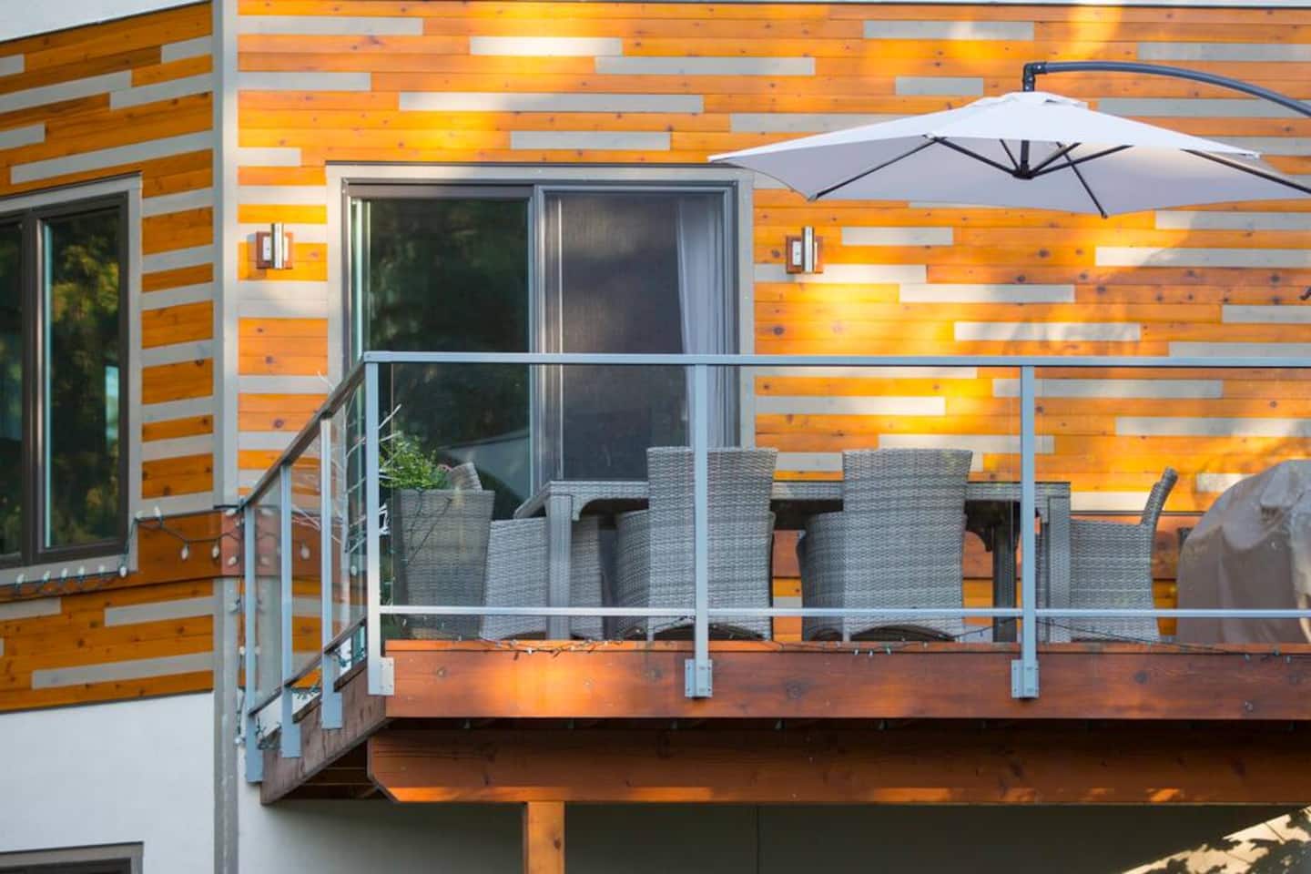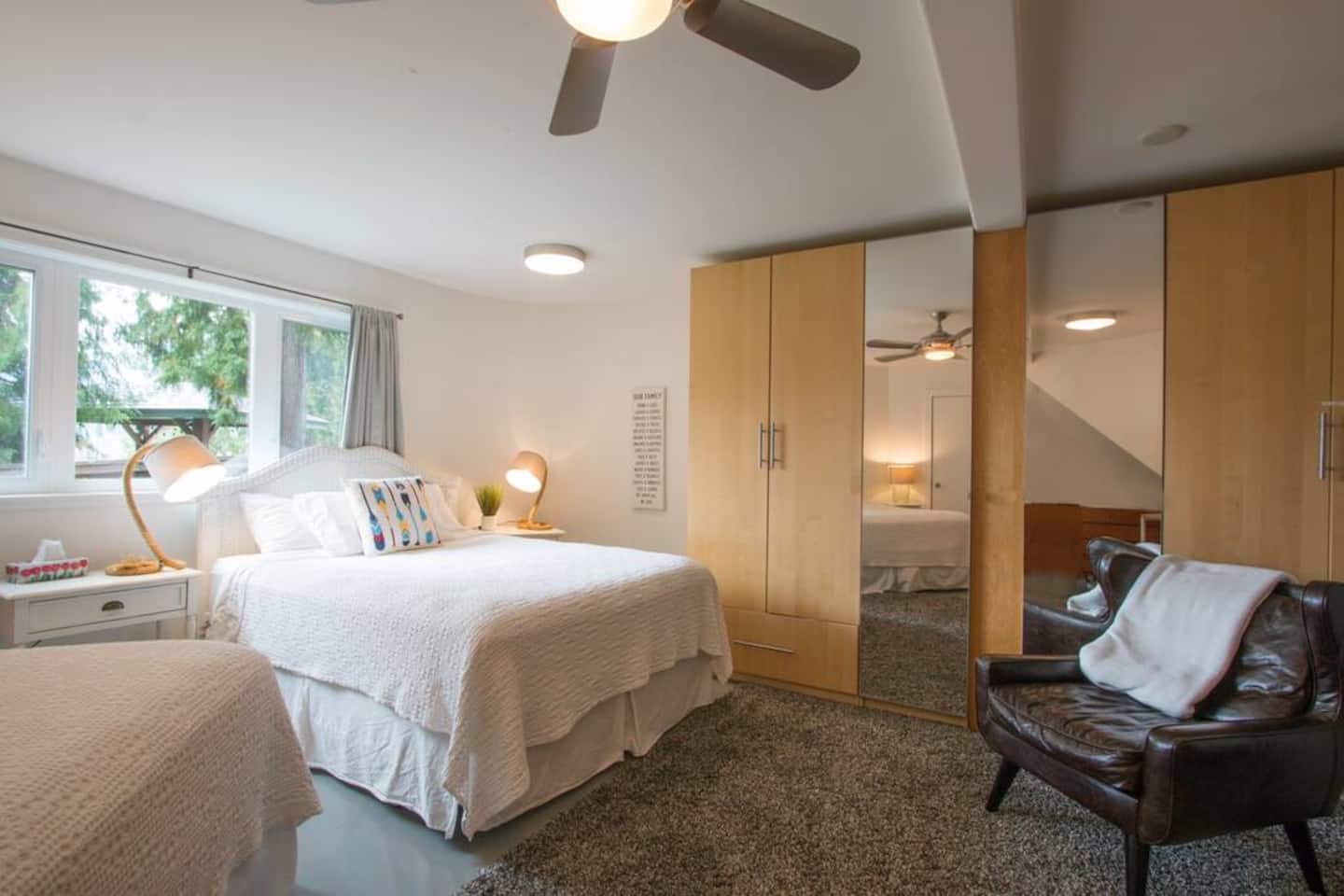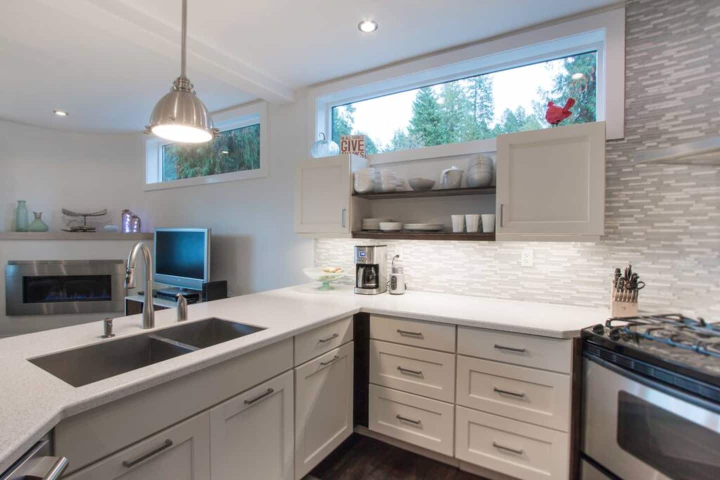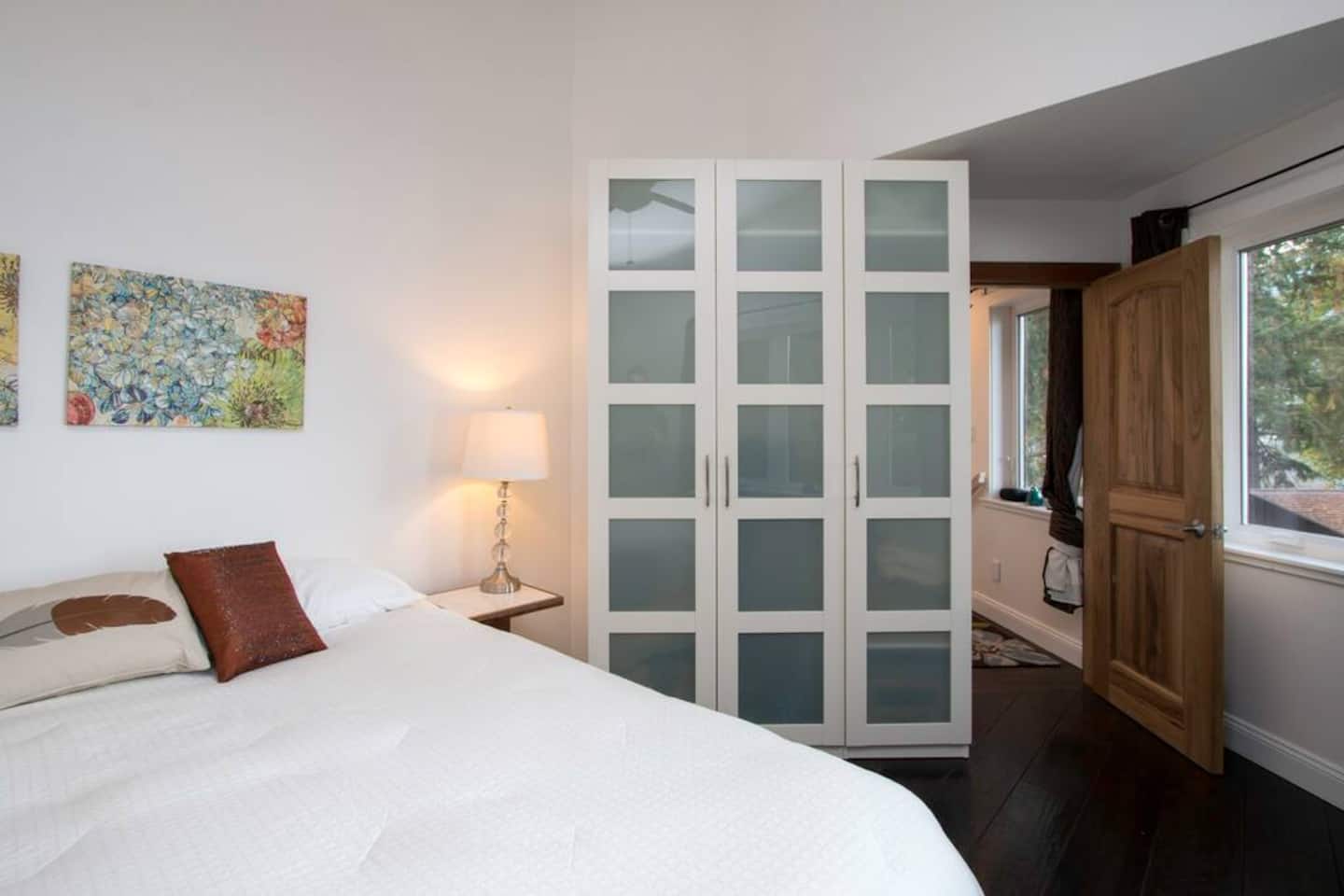 The home is modern and with a beachy feel. There are unique round walls and vaulted ceilings. The lakefront is gorgeous with stunning views up the lake.