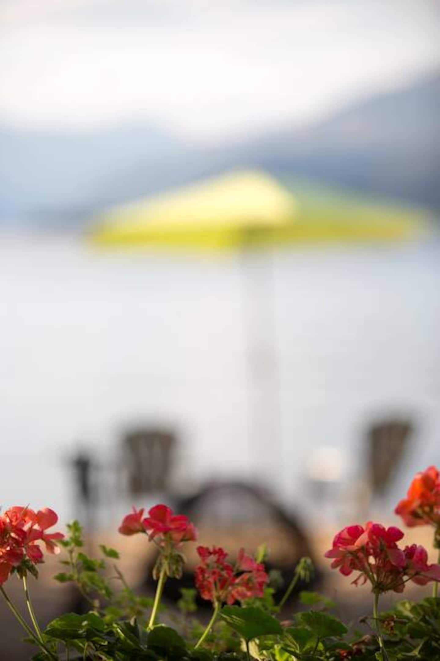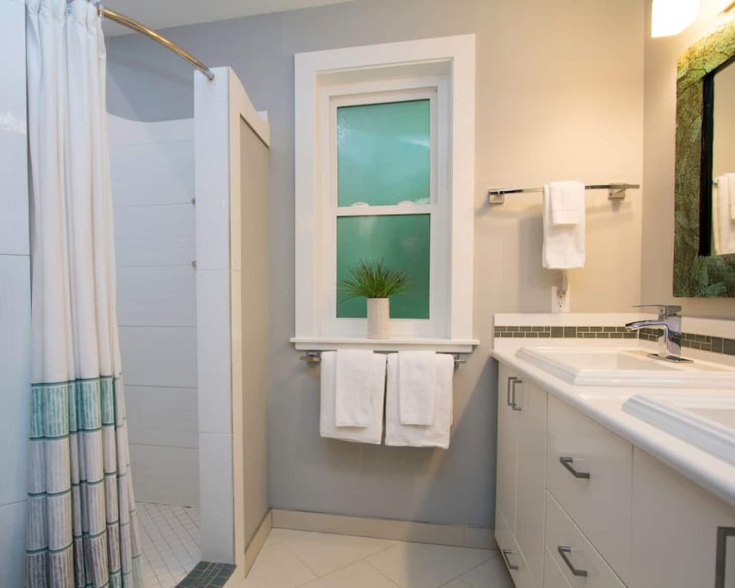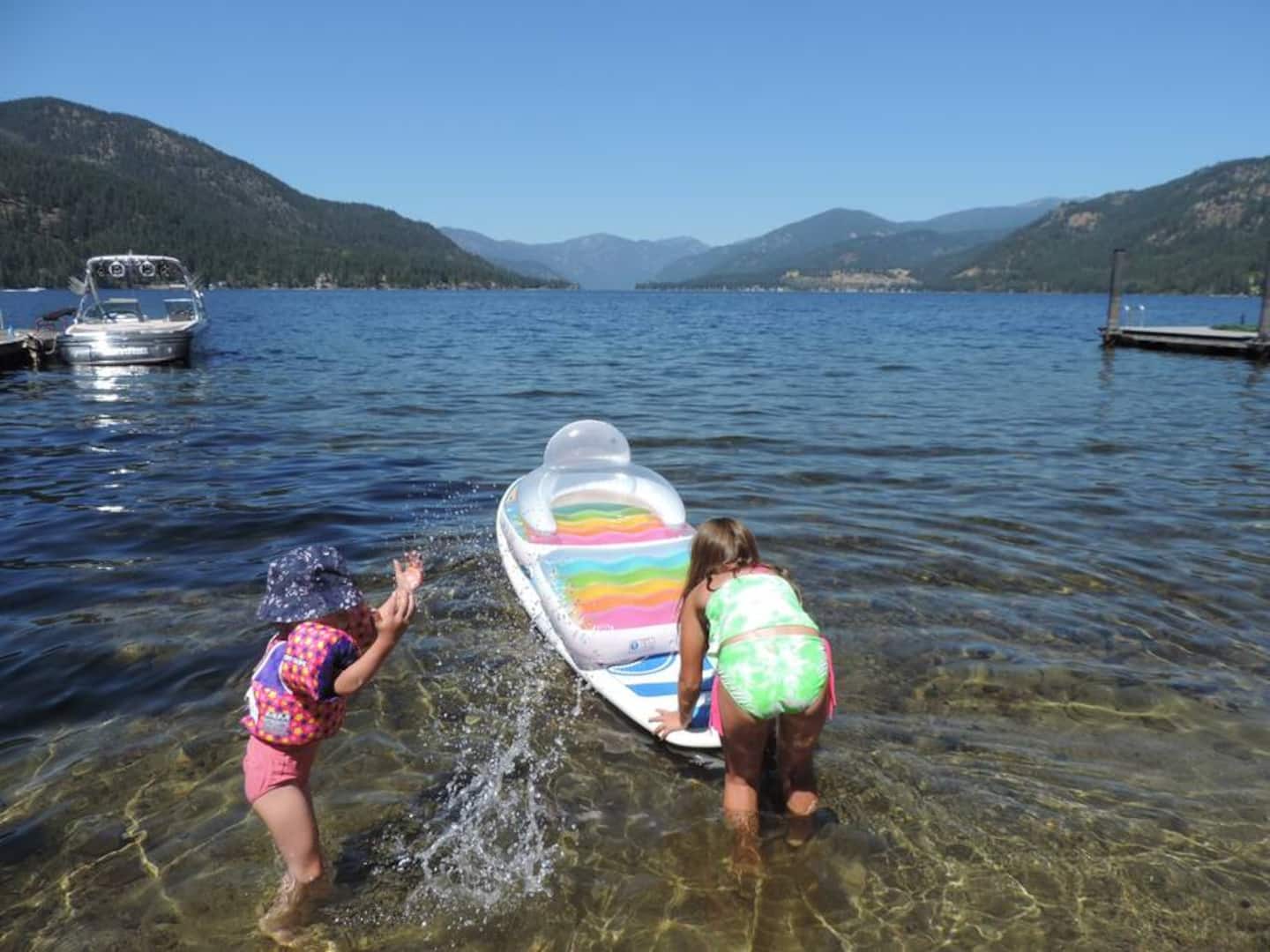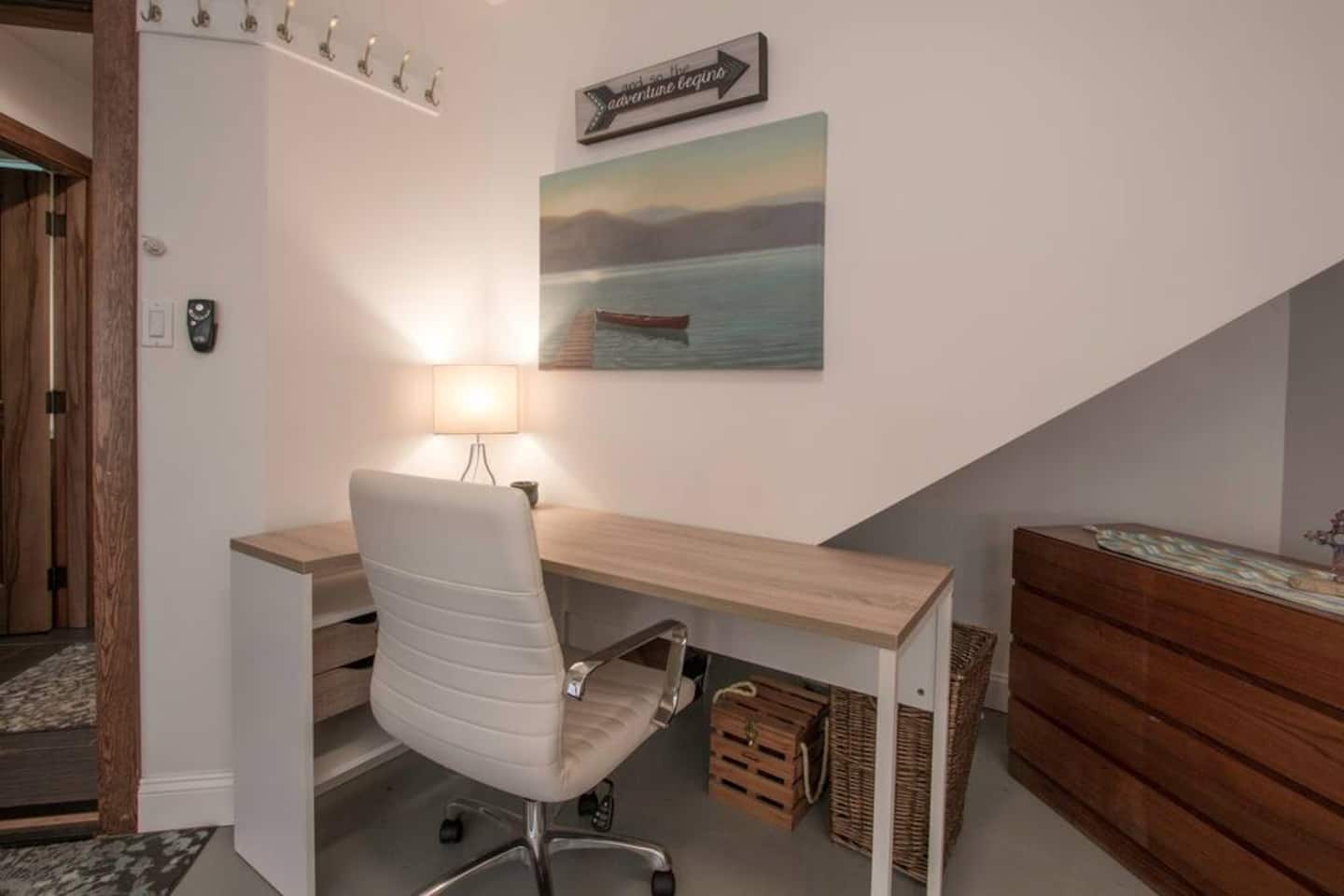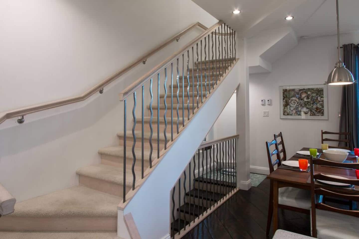 The home is modern and with a beachy feel. There are unique round walls and vaulted ceilings. The lakefront is gorgeous with stunning views up the lake.