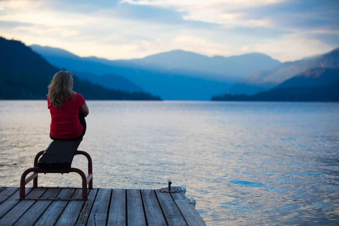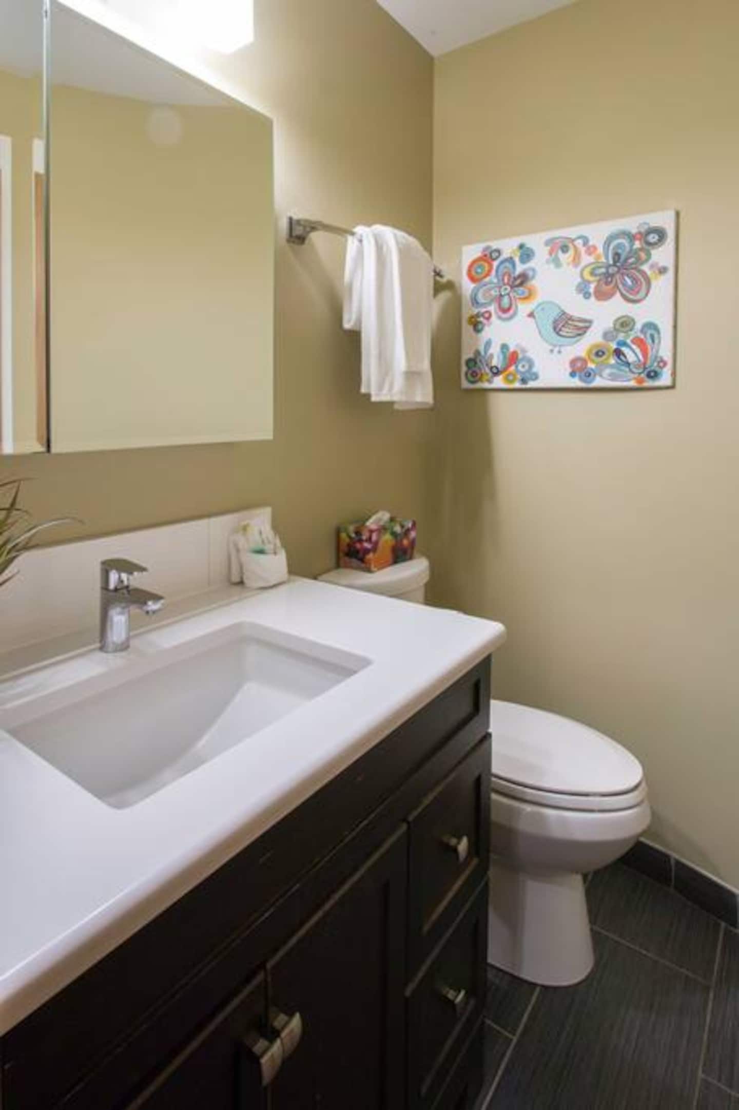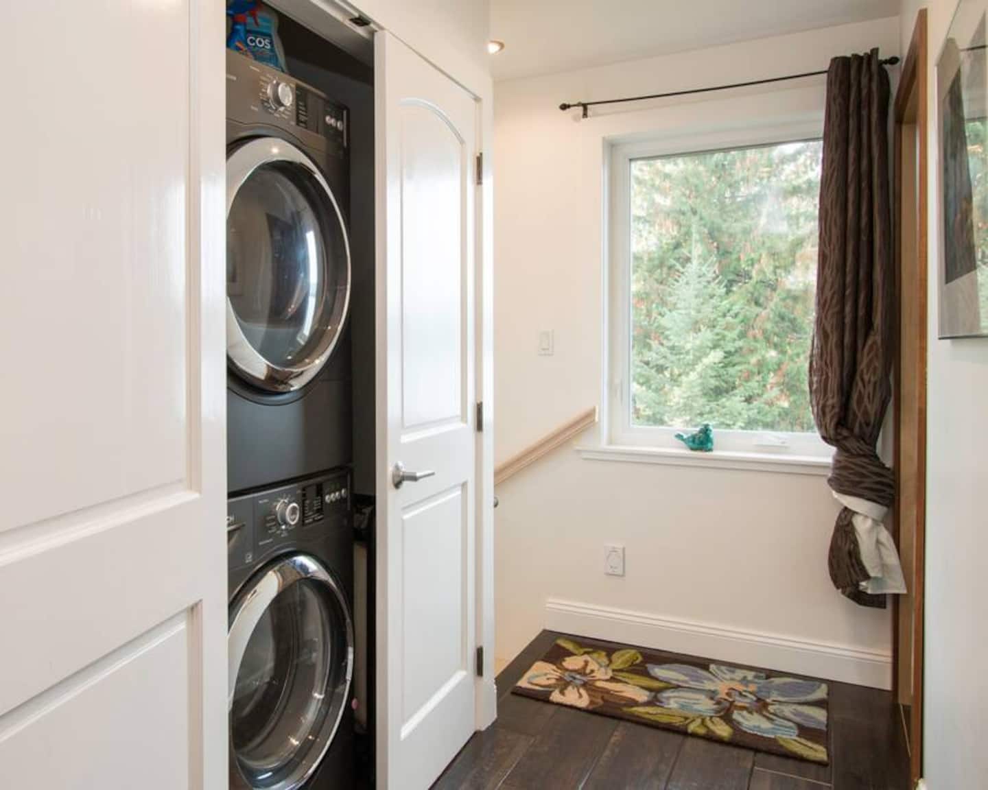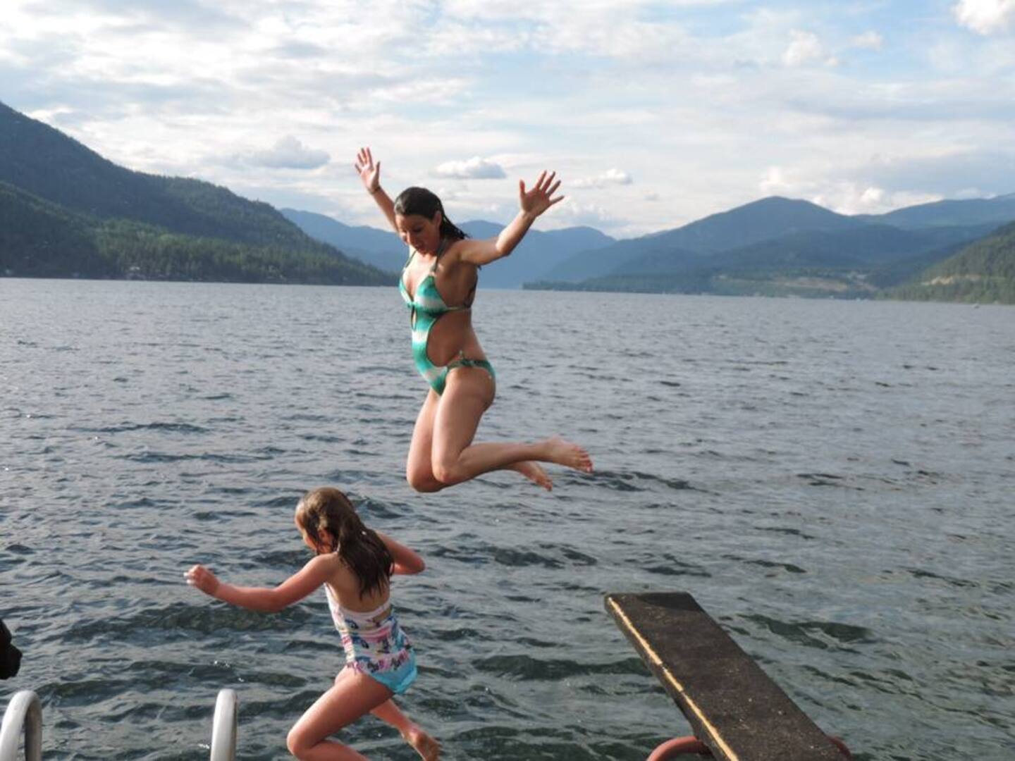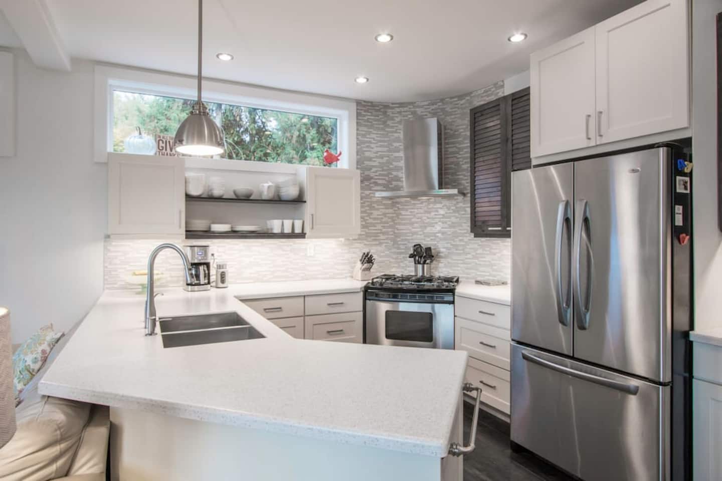 The home is modern and with a beachy feel. There are unique round walls and vaulted ceilings. The lakefront is gorgeous with stunning views up the lake.